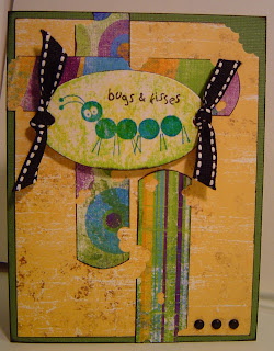 I used TAC's "Hip Hop" paper which I absolutely love! The colors are gorgeous and so bright! The bug is stamped on a chipboard piece that is part of the "Essential Elements" chipboard collection and is up on pop dots. I used several sizes of hole punches to make the holes in the strips to make it look like the bug was taking bites out of them. Both cards are very similar. The yellow one is just toned down a little so that it wasn't so bright. The yellow background paper is from the TAC "Sands of Time" paper pack.