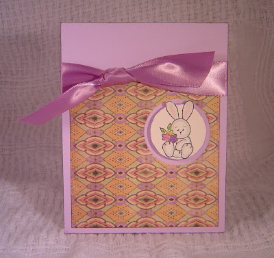 On the first card, I stamped the bunny, then took and drew a circle around where I would later use a punch to punch the circle shape. Before, I punched it out though, I cut out her ears with an exacto knife those parts that would be out of the circle. Then, I carefully punched the image out using my circle punch. I also took a larger punch and punched a circle out of the patterned paper allowing the purple cardstock behind to show through.