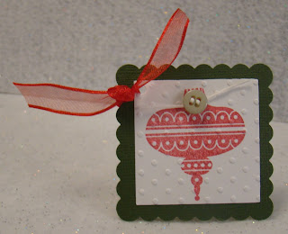 For this one I used a darker green Bazzill for the base. I stamped the same ornament on a white piece of cardstock and THEN ran it through the Big Shot to give it the texture and then added the button. Again, easy peasy!