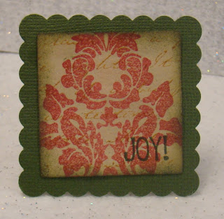 I stamped Victorian Elements with Lamore Red ink, then stamped scripted background with Cognac ink. I sponged Jardin Moss ink around the edges of the piece, stamped Joy from "Holiday Cheer" and then adhered to the scalloped square. Elegant and SUPER simple!