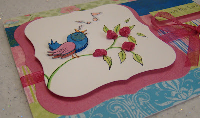 In the photo above, you can see the dimension on the card. The bird is popped up and so is one layer of the nestabilities label die. The ribbon is tied between the two nestabilities layers.