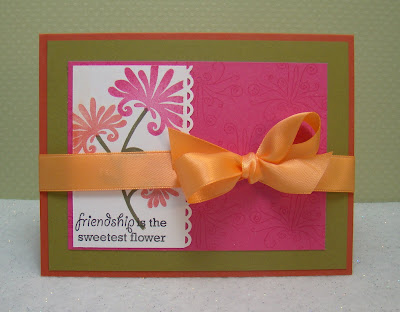 This is a great card. I absolutely love the colors. Just an example of why I need Dawn's color help. Never would have come up with this combo. Very nice with the floral image.