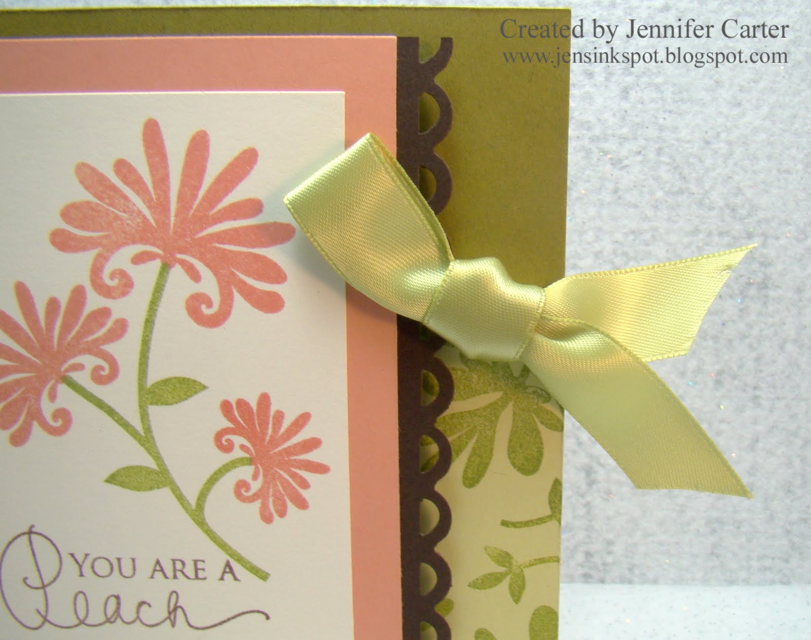 I love these colors together! So pretty! I tied my "bow" a little differently again. I've shown you this before but it is a fun way to tie short pieces of ribbon. Instead of tying a bow, pull one end all the way through and you have more of a loop. It is a fun look!