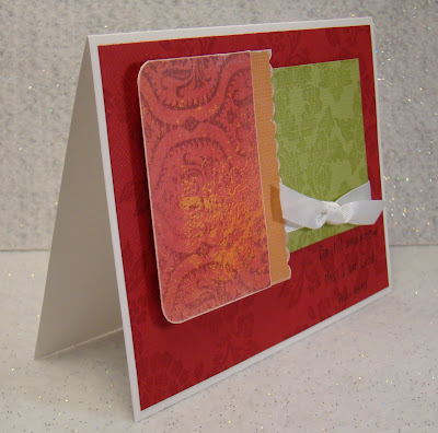 The red background and the green piece are both stamped with VersaMark onto the colored cardstock using "Victorian Elements". The orangish/red piece? That's from the Rockin Roxie Matchbook Kit. I took a piece of it and cut it to the size I wanted and put it on the card. So, even if you aren't into making little books, you can use the pieces in the kits for other things, like cards! :)