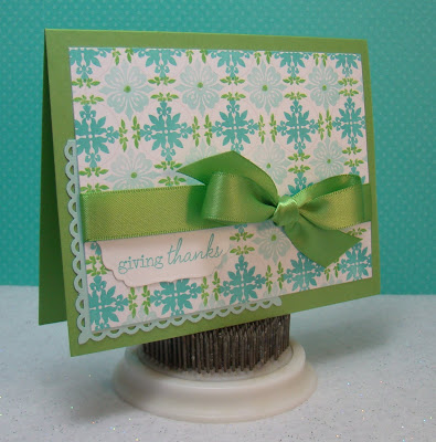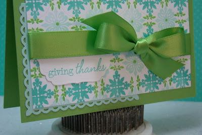 In the above photo, you can see the details a little more closely. On the aqua shapes I stamp a green center using the smallest polka dot from "Polka Dot Basics" to add just a little bit more green to the paper. I also die cut a Nestabilities Labels 4 shape, cut it in half, stamped my sentiment on it and then adhered. And, isn't that ribbon a perfect match for the New Leaf paper? I found that at the last minute at a Michael's trip! Score!