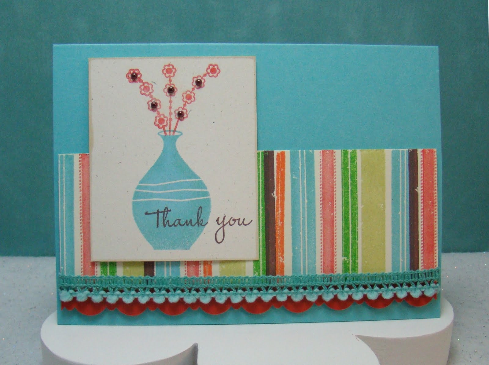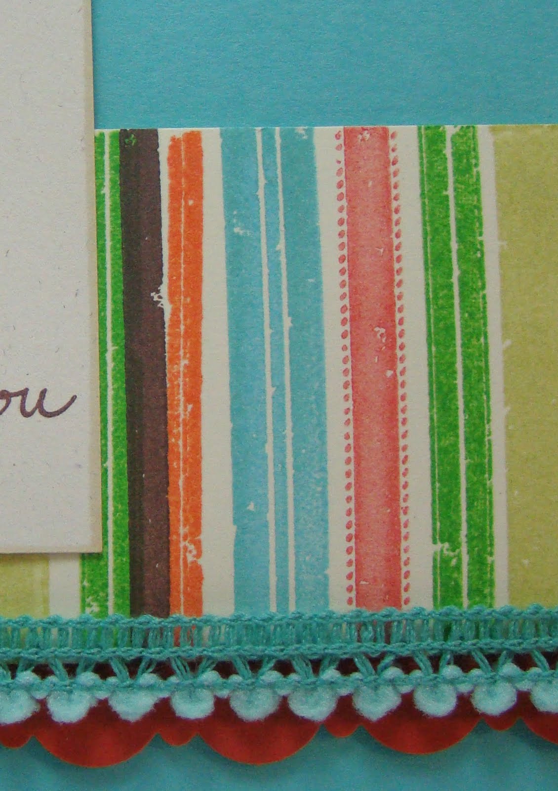 Here's a closeup of the stripes. The colors I used are PTI Hawaiian Shores, Terra Cotta Tile, Spring Moss, Palette Giverny Green & Orangerie & Jumbo Java VersaMagic and they are stamped on ivory paper. Aren't those mini pom poms cute? I ordered those from an etsy shop called Sugar Pink Boutique. Be prepared if you click on that link because she has some CUTE stuff and you will want some! :)