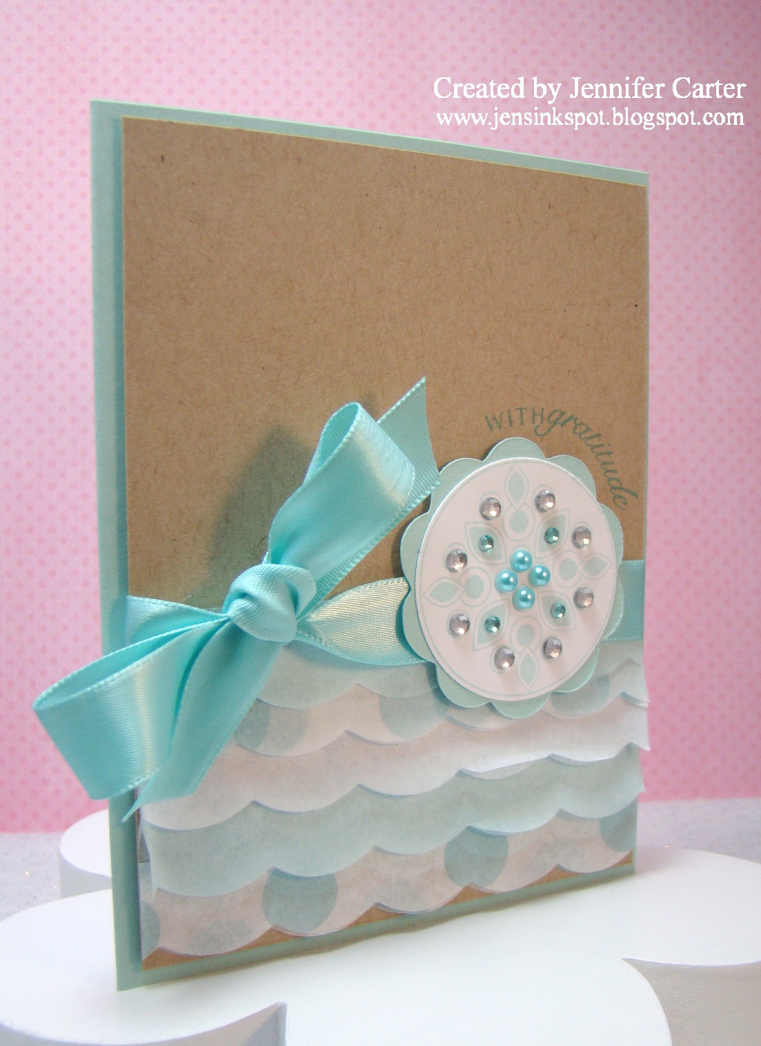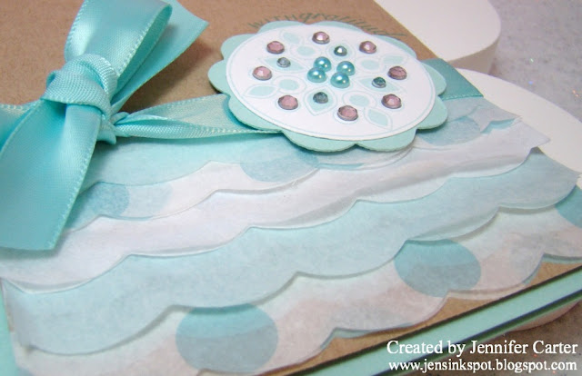 Here's my first card (stay tuned for more cards using tissue paper in the next few days). I used a scallop border die to cut the tissue scallops in white, aqua and polka dot. There are three layers of tissue in each column. It makes such a delicate border!