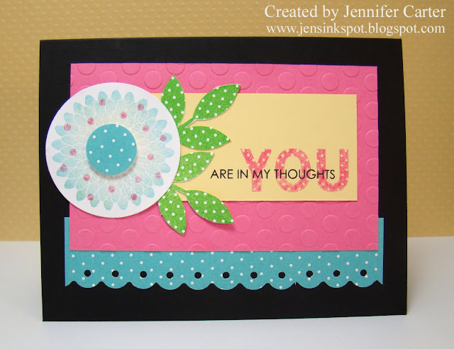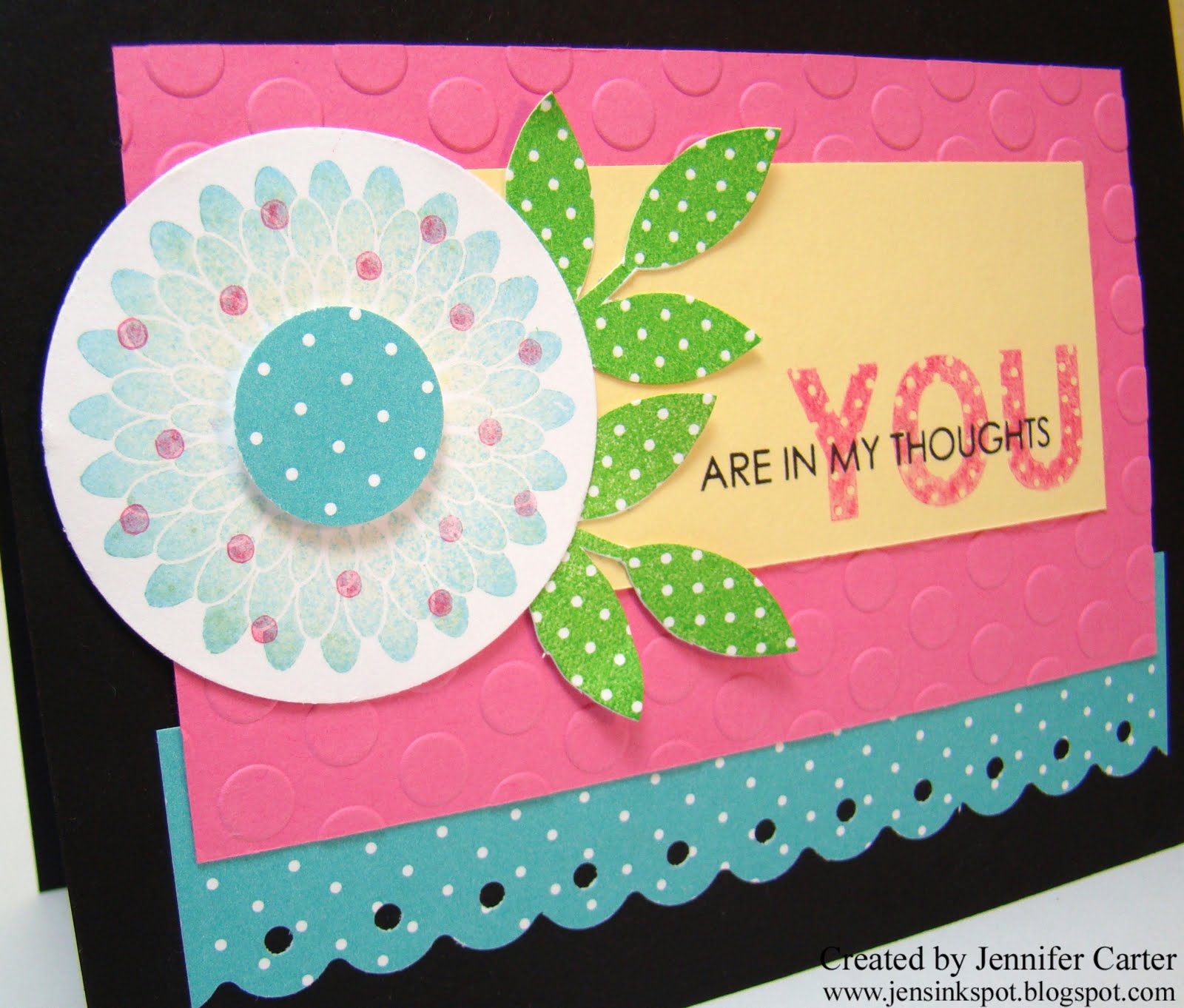 I love the details on this - the pink dots on the flower and the holes in the scallops. This is a great card, Jen. BTW, I saw the FB post about those rings, which are great! I would like one!