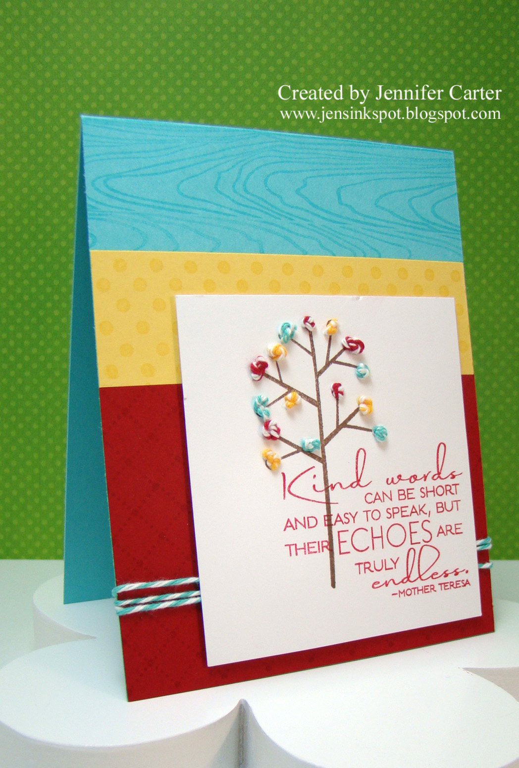 This is one seriously cool card Jen! I love this color combo and just might have to play along with this color challenge. I LOVE the knots on the tree branches, the twine around the base of the card, the sentiment overstamped on the tree, and well just about everything!! This card is a favorite of mine!!