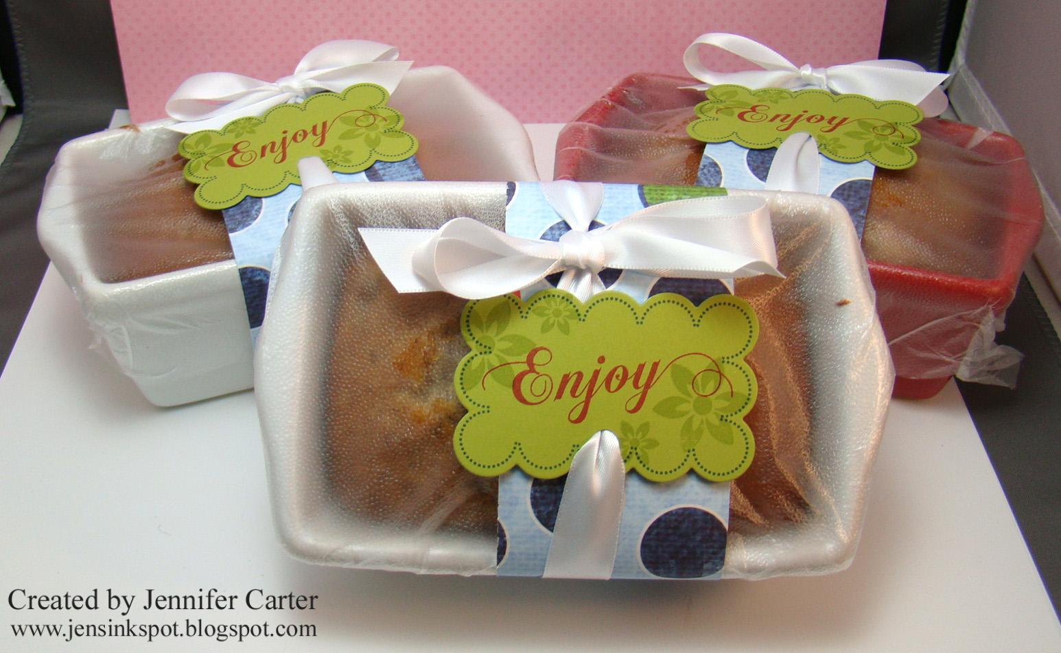 Jen, yum! What a thoughtful treat for your neighbors, and how cute are the decorated? I love how you punched the ribbon through and behind the FF! Now I'm craving banana bread . . . :-D