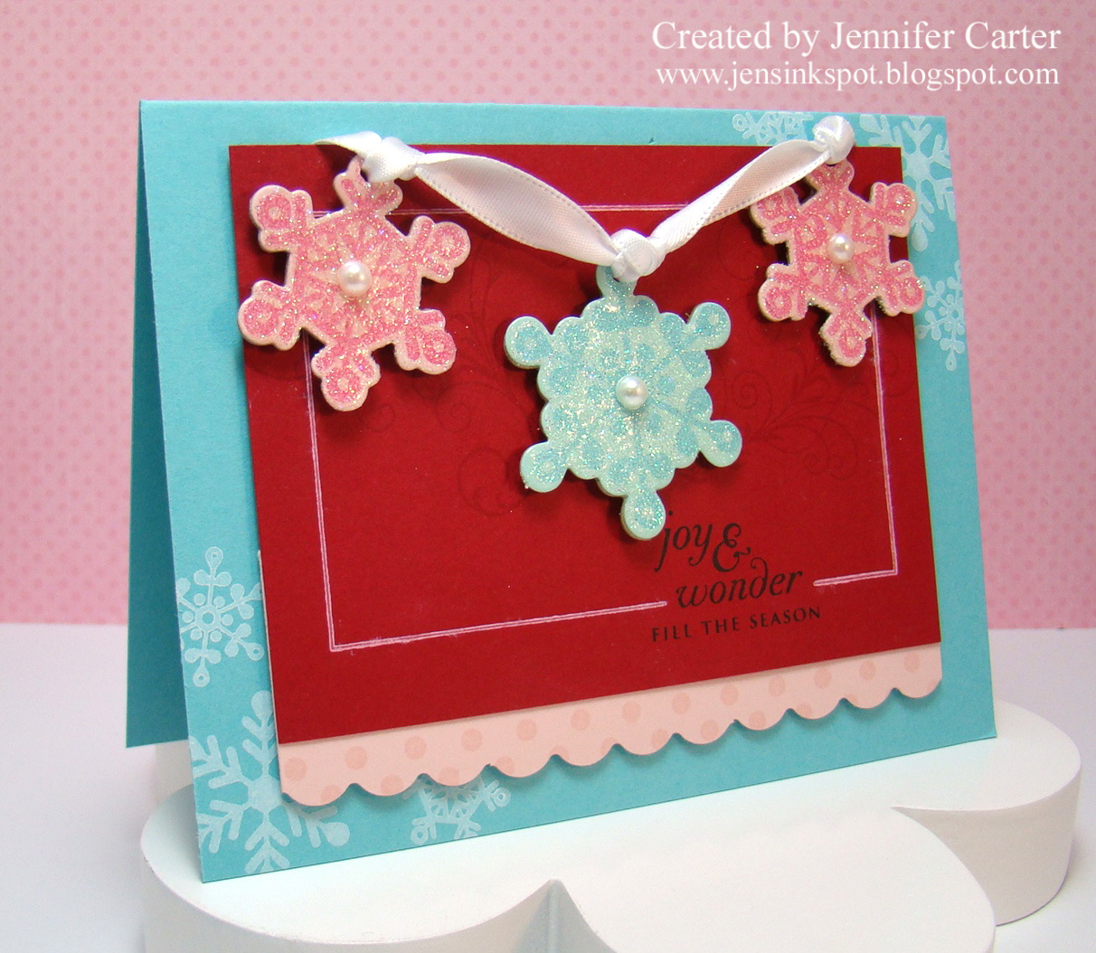What a cute idea to hang the snowflakes from the ribbon. I never would have thought of that. I also love the sentiment you placed within the frame opening. Very pretty card Jen.