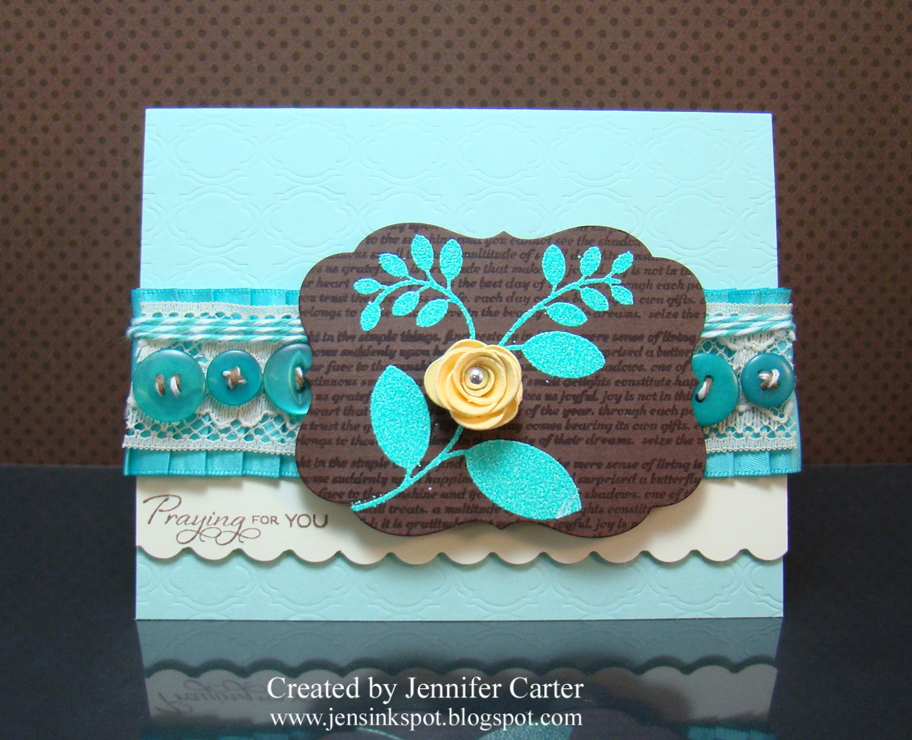 Oh Jen, I am just so happy for you! I can NOT wait to see what goodness you make with The Twinery twine! Thank you so much for "making" me order the sampler pack month's ago....LOL! It truly is the best twine out there. That being said, your card is just gorgeous! I love that fun embossing powder color and how you used the flower in place of a button! Ok, now you've enabled me again.....you said you found that fun trim at HL? Ack, now I need to make a trip there this week!!! Wow, I've missed talking to you this week!