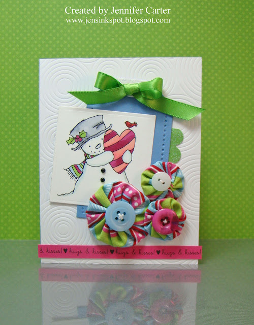 I used a digital snowman image on this card...my first ever I believe. The snowman is colored with copics and I added rhinestones for his buttons. I thought that the fabric I used for the yo-yo's were fun wintery colors, so that is what I based the card's color scheme on.