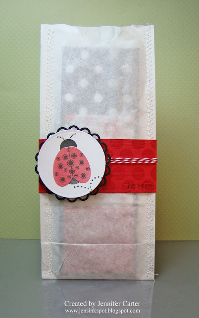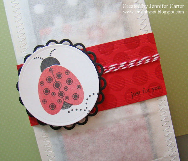 The only thing I decorated the sack with was this little band. I cut a strip of paper to 2 x 11 and then ran the middle part through my Big Shot with the music sheet impression plate. Then, I stamped the entire strip with VersaMark using Polka Dot Basics. I then scored the lines and folded it around the sack, wrapped the twine from The Twinery around the band and adhered my ladybug circle piece. Quick and easy but I love how it dresses it up just enough!