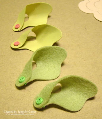 Isn't that a cute set of leaves? For this one, I started at the long end of the pinwheel die and just started rolling, much like you would if you were creating a rolled flower. When I got to the end I used a little bit of hot glue to adhere the felt leaf in place.