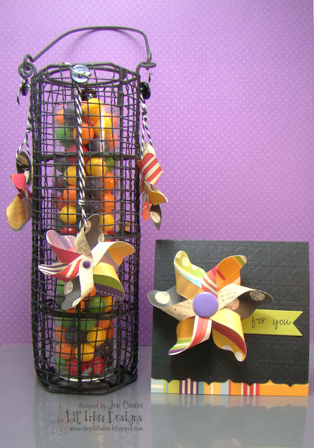 Super cute project, Jen!! LOVE the dangling brightly colored pinwheels and how they perfectly complement the gobstoppers!! And way to go repurposing that vase container!!