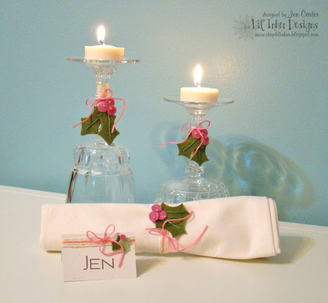 Jen!!! SQUEEEEE!!! You've done it again, Crafty Lady!! This is totally AMAZING! My favorite part is the place card because I love the use of 2 different colors of felt for the holly leaves. That's brilliant. I also think the twine you've stitched down the center of the holly when cut with felt truly truly adds a fabulous touch. This is just amazing and something your fans and LID's will ADORE!