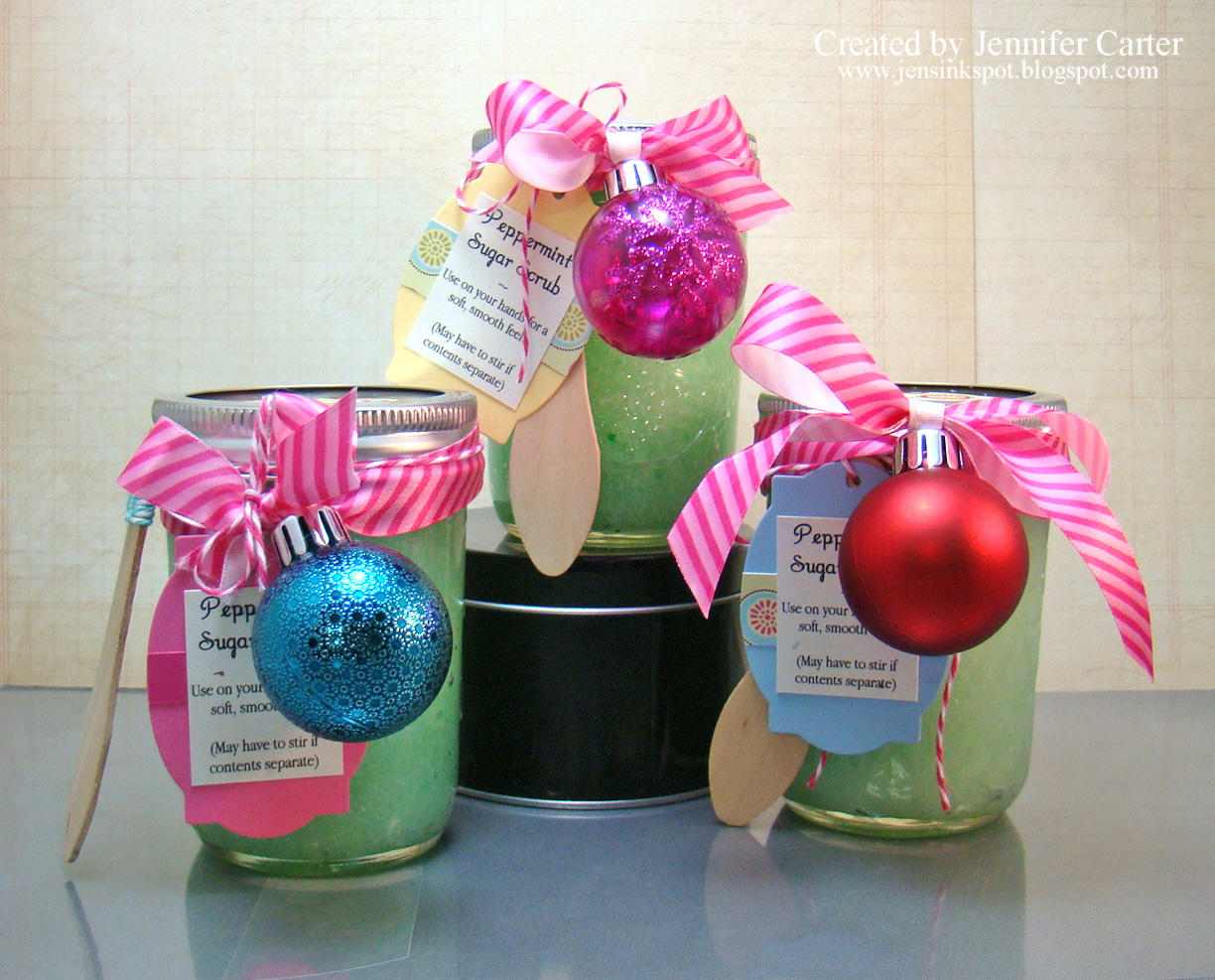To decorate the jars, I tied a ribbon around the lid of the jar and hung a mini ornament from it and then tied a bow.  I also tied a tag (that told what the product was with simple directions) and a little spoon (to get the scrub out with and to stir it up if it seperates) onto the ribbon piece with various colors of Twinery twine. I also punched a piece of patterned paper and attached to the top of the jar.