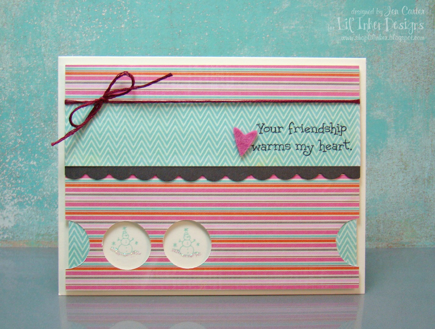 Jen, these are just darling! I love how you did the sentiment and the pinking edge down the side. And for those stinking cute little snowmen???? (see you have another snowman image....hehe) I love how you incorporated this image and made a luv card!! :)