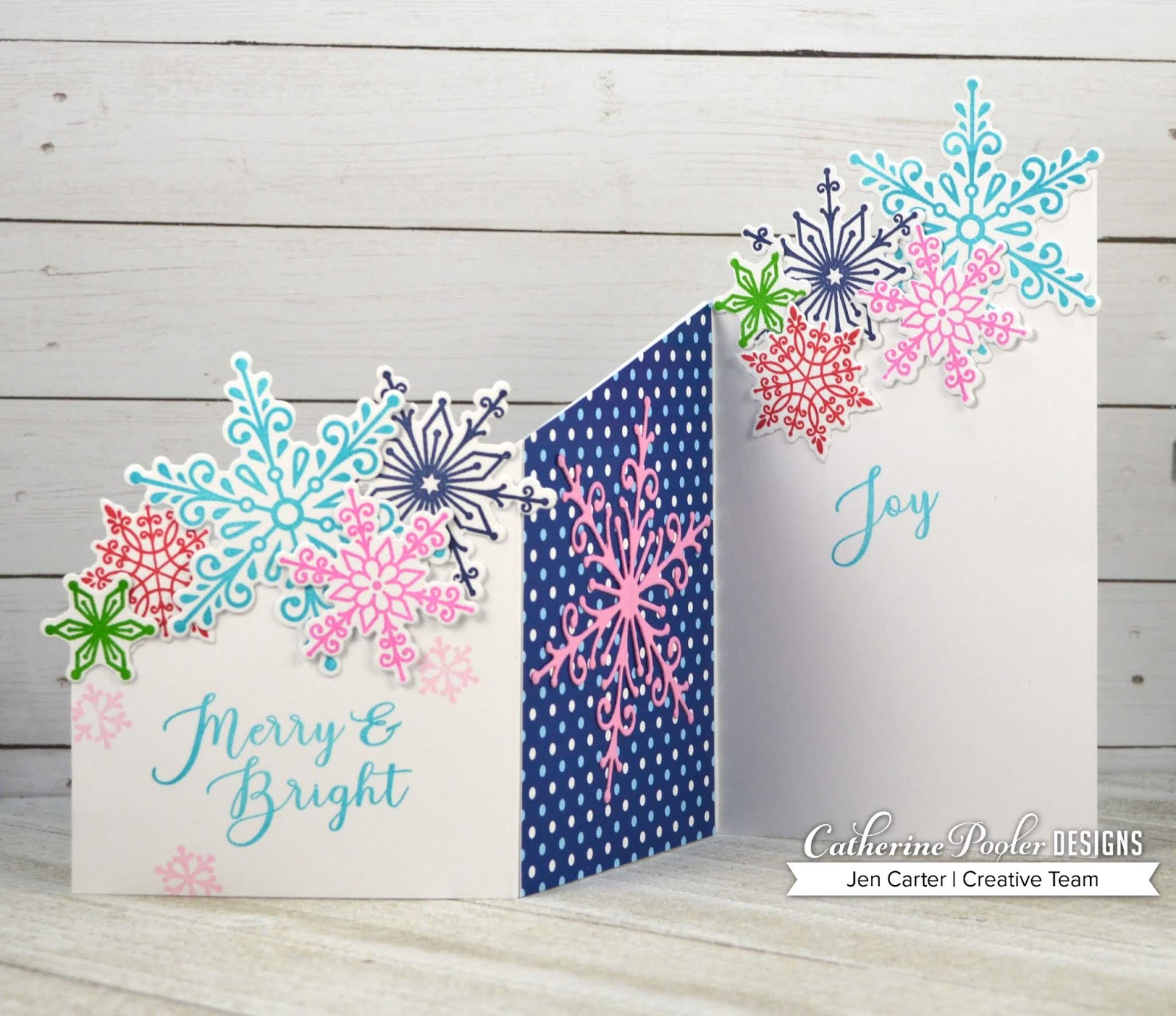 On this card I used the GORGEOUS Peaceful Flakes stamp set and coordinating Peaceful Flakes dies. I also used the beautiful new Delicate Snowflake Die. The paper is also new & called Snowy Day. The ink colors are: Grass Skirt, Be Mine, It's a Girl, Juniper Mist, Rockin' Red & Fiesta Blue.