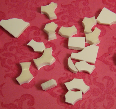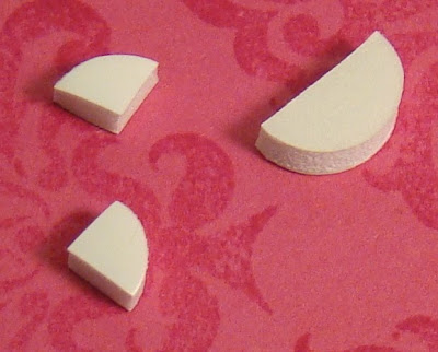 Very rarely, do I use a WHOLE pop dot though. These pop dots are nice and thick, so unless I am applying them to a really BIG section (and it would have to be big), I almost always cut them in half or in fourths. It makes the pop dots go a LONG way. Sometimes when I am using them in my scrapbooks, I'll be a little more generous and use a complete circle, but even then, I don't always do that. Here's what they look like cut apart in half & in fourths.