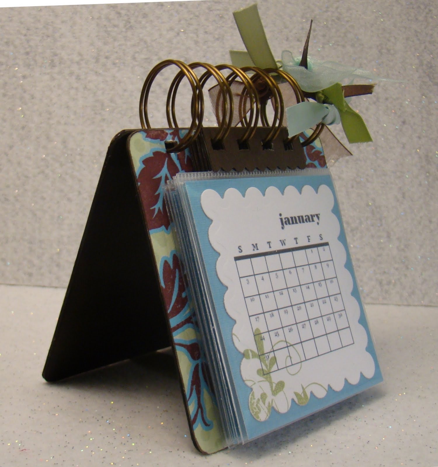 Come make one of the cutest mini spiral-bound calendars with square scalloped shaped pages! We'll make one mini calendar perfect for your desk or kitchen counter! Each month you flip the page to reveal the next month.  Choose from a variety of color schemes, decorative stamps and ribbons to "dress up" your calendar.