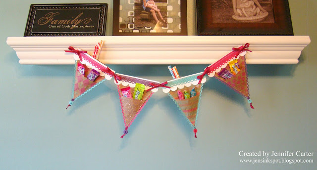 How it is made: I took a brown paper bag and drew a triangle pattern with the point at the bottom of the bag.  I then sewed each side with a sewing machine (I did not sew the top where it opens).  Because the bottom of the bag was folded up, when I sewed it, it created a pocket which is where you see the Laffy Taffy/Tootsie Rolls.  Also, since I didn't sew up the top part, it created a second pocket where I put the pixie sticks.  I then attached the decorations (scallops at top & sides attached with strong tape/glue).