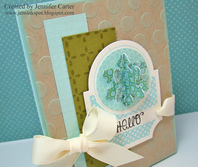 You can see that the polka dots (Quickutz Embossing Folder) also have some color.  After I embossed the Kraft cardstock, I took a Aquatic Splash VersaMagic Dew Drop and gently ran it over the dots and also around the edge of the cardstock to soften it and give it even more added dimension.  I like the look it created.  The ink pads are spongy so it is very easy to do this.
