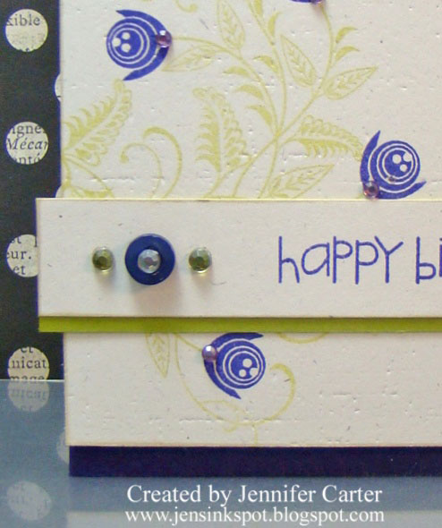 If you take a close look you will see that I used PTI's Sheet Music background stamp on the label shape. It is stamped with PTI's tea dye ink very lightly. I stamped the flower with the Swirly Bouquets set (can you believe that I don't have a silhouette stamp set!?) and the stem from that same set in Sweet Blush ink to make the flower appear as a silhouette. I also added white pearls that I had colored pink with my copics to match the ink...love that technique!