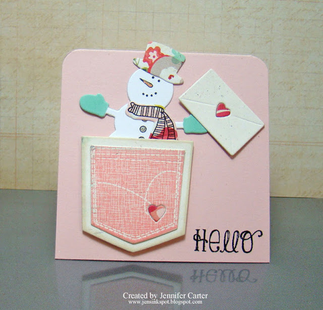This is probably my favorite of the group.  I love this little snowman peeking out of the pocket!  It looks like he is surprising someone with a special delivery.