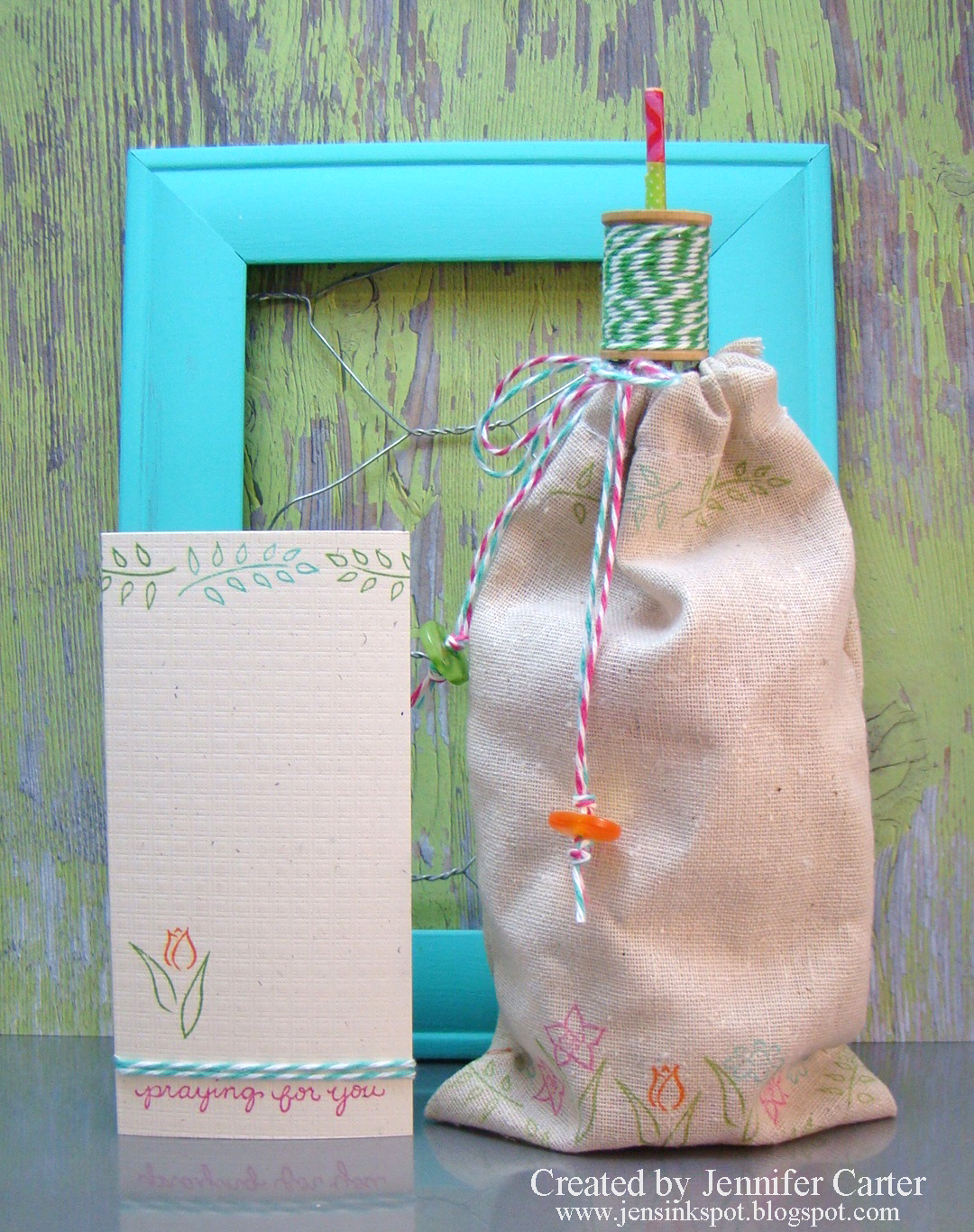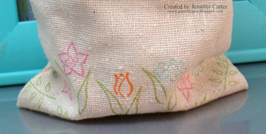 The sets I used from Denami are Spring Flowers Set (Cling) & the Praying for You sentiment. To make the bag I took a piece of muslin and cut a long strip and then folded it in half.