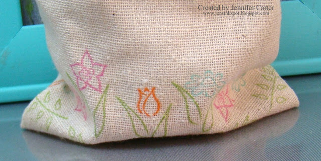 I used my die inks to stamp the flowers on the bottom of the bag. After I had each side stamped, I folded over each top part of the bag and sewed a seam leaving enough room to thread my twine through the gap. I then stamped the top of each side of the bag with the leaf image.