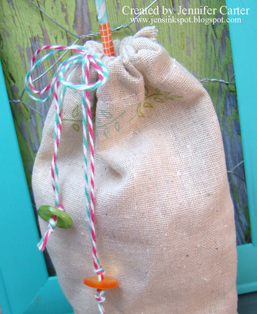 After I finished stamping, I threaded my Pink Sorbet & Caribbean twine through the top and then attached buttons to the end so that it wouldn't be easily pulled back through the gap.